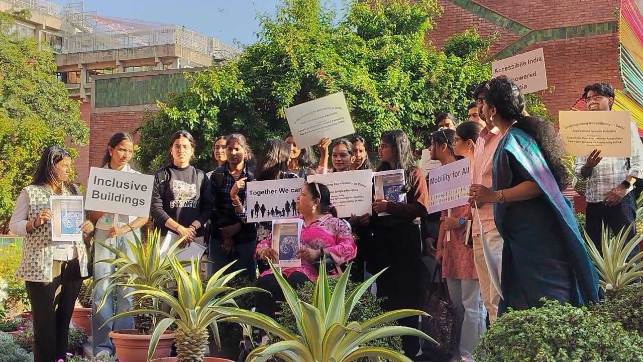 The afternoon sessions included Waste, Urban Design & Innovation with The Malba Project, led by Ar. Shamita Chaudhary, who re-examined construction and demolition waste through the Malba Walk, encouraging participants to view “malba” as a future material and reflect on more circular and responsible design approaches. Community Spaces, Access to Design & Affordability with the Social Design Collaborative, led by Ar. Swati Janu featured a Yamuna Walk and dialogue with the Kisan Basti community, exploring the co-creation of a flood-resilient Anganwadi built using locally available materials. Understanding Accessibility in Delhi with Samarthyam, led by Dr. Anjlee Agarwal, included an accessibility audit of the Indian Habitat Centre, which highlighted how even reputed buildings can fall short of basic accessibility requirements.